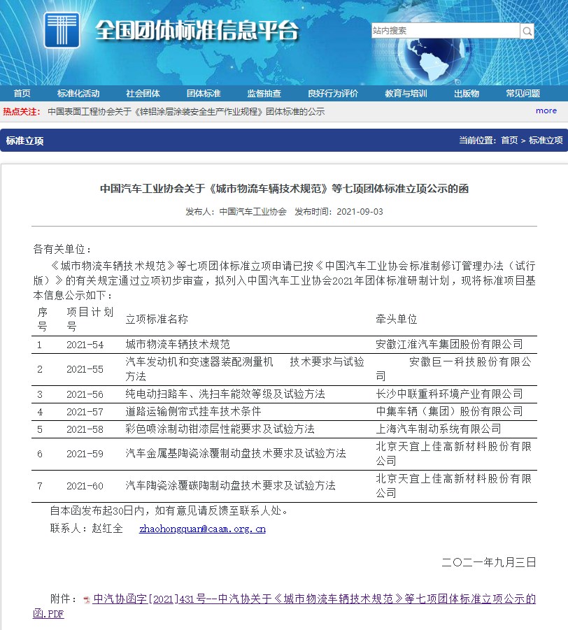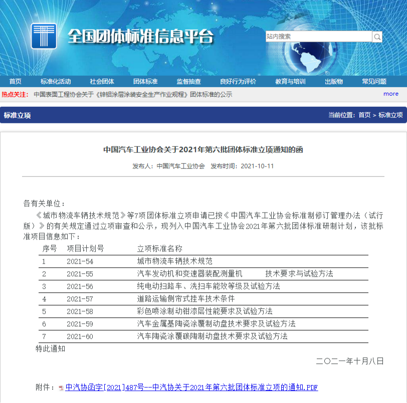 近日,中國汽車工業(yè)協(xié)會發(fā)布了《中國汽車工業(yè)協(xié)會關(guān)于2021年第六批團(tuán)體標(biāo)準(zhǔn)立項通知的函》(中汽協(xié)函字【2021】487號)。通知指出,經(jīng)專家評審、審查、公示,北京天宜上佳高新材料股份有限公司(以下簡稱“天宜上佳”)申請的《汽車金屬基陶瓷涂覆制動盤技術(shù)要求及試驗方法》和《汽車陶瓷涂覆碳陶制動盤技術(shù)要求及試驗方法》 2項團(tuán)體標(biāo)準(zhǔn)制定項目成功獲批立項。