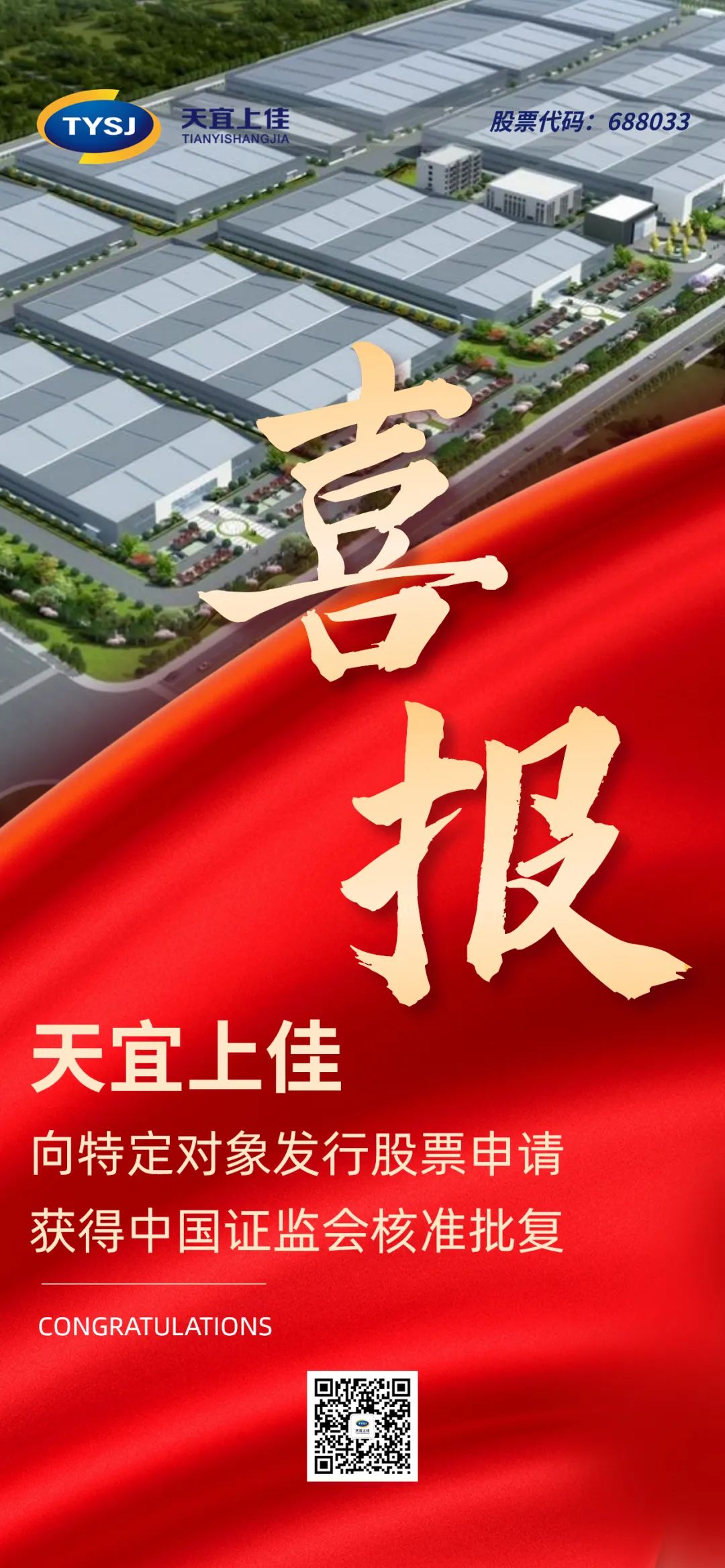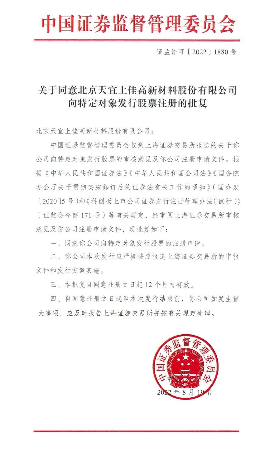 2022年8月30日,天宜上佳收到中國證監(jiān)會(huì)出具的《關(guān)于同意北京天宜上佳高新材料股份有限公司向特定對(duì)象發(fā)行股票注冊(cè)的批復(fù)》,公司定增事項(xiàng)正式獲批!