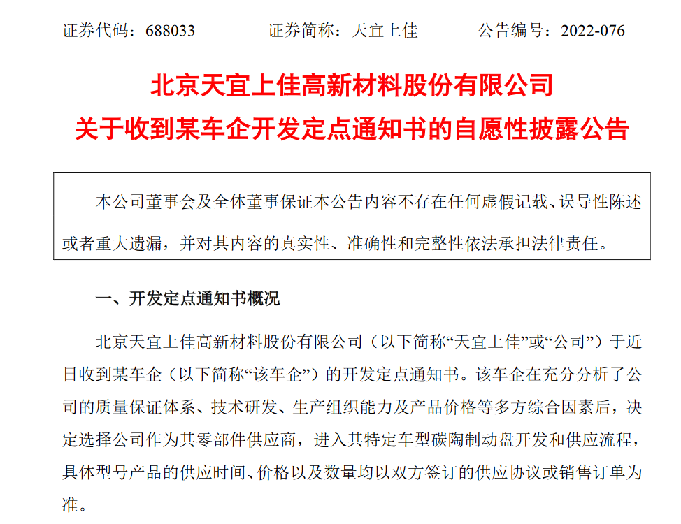 北京天宜上佳高新材料股份有限公司(以下簡稱“天宜上佳”或“公司”)于近日收到某車企(以下簡稱“該車企”)的開發(fā)定點通知書。該車企在充分分析了公司的質(zhì)量保證體系、技術研發(fā)、生產(chǎn)組織能力及產(chǎn)品價格等多方綜合因素后,決定選擇公司作為其零部件供應商,進入其特定車型碳陶制動盤開發(fā)和供應流程,具體型號產(chǎn)品的供應時間、價格以及數(shù)量均以雙方簽訂的供應協(xié)議或銷售訂單為準。