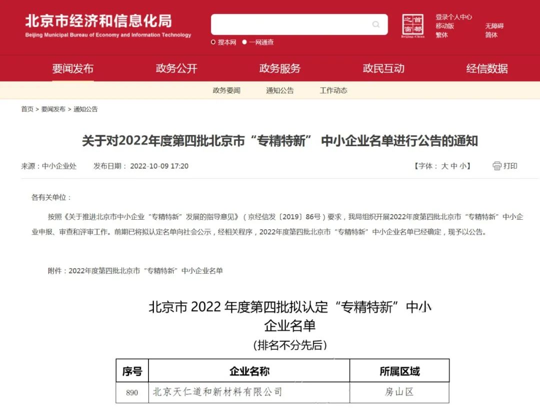 近日,北京市經(jīng)濟和信息化局官網(wǎng)發(fā)布《關(guān)于對2022年度第四批北京市“專精特新” 中小企業(yè)名單進行公告的通知 》,北京天仁道和新材料有限公司成功入選。