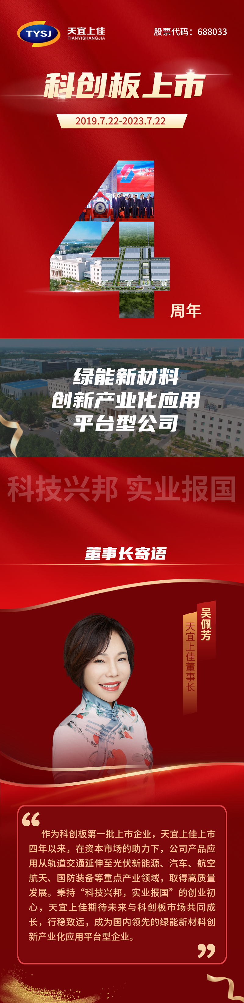 如今,在近四年的成長中,天宜上佳不僅是科創(chuàng)板市場發(fā)展的親歷者和見證者,公司自身也完成了從一家單一軌交閘片業(yè)務科技企業(yè),到極具復合性的綠能新材料創(chuàng)新產(chǎn)業(yè)化應用平臺型公司的華麗轉(zhuǎn)型,成功開拓圍繞碳基復合材料業(yè)務的“第二增長曲線”。