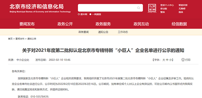 近日,北京市經(jīng)濟(jì)和信息化局官方網(wǎng)站發(fā)布了《關(guān)于對2021年度第二批擬認(rèn)定北京市專精特新小巨人企業(yè)名單進(jìn)行公示的通知》,北京天宜上...